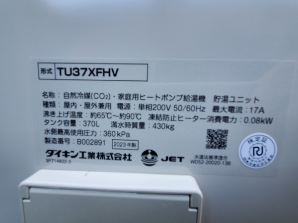 紀宝町 ダイキン自然冷媒(CO2)・家庭用ヒートポンプ給湯機貯湯ユニットTU37XFHV エコキュート交換工事